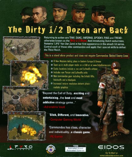 The Dirty 1/2 Dozen are back in action. Lead the team into harms way in Commandos: Beyondthe Call of Duty. You are in command of Tiny, Spooky, Duke, Fins, Tread, and Inferno as they sneak into Eastern Europe, Greece, and Germany to finish the job they started. Armed with new weapons and devious decoys, the Commandos vow to fight untilvictory. However, the Germans have other plans for the boys. They have doubled their vigilance and strengthened their bases with Panzer and Luftwaffe reinforcements.